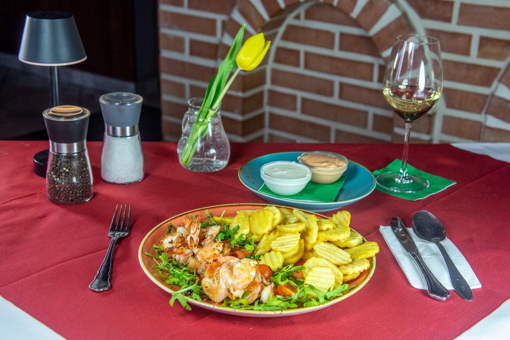 2 Rippenstücke gegrillt mit Dukatenkartoffeln, Cocktailsauce, Knoblauch, mit Zwiebel und Paprikasalat